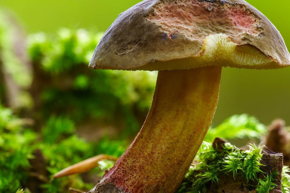 Röhrling Pilz wächst auf einem bemoosten Baumstamm in einem Laubwald im Herbst