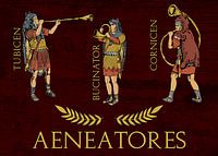 Diese kunstvolle Darstellung zeigt drei römische Blasmusiker, bekannt als Aeneatores, in voller Montur. Links ein Tubicen mit seiner langen Tuba, in der Mitte ein Bucinator mit dem gebogenen Bucina und rechts ein Cornicen mit dem kreisförmigen Cornu. Die Musiker tragen typische römische Rüstungen, teils mit Wolfs- oder Bärenfellen über…