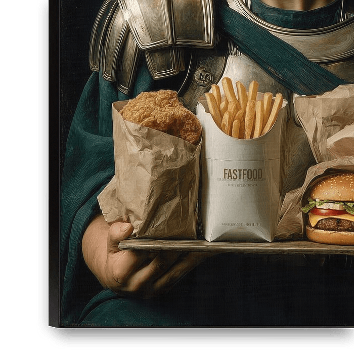 Ein humorvolles Gemälde, auf dem ein junger römischer Soldat klassische Pracht mit einer überraschend modernen Fast-Food-Szene verbindet, die eine fröhliche und verspielte Atmosphäre ausstrahlt. Die Mischung aus altertümlichem Licht, barocken Details und zeitgenössischen Snacks schafft einen charmanten Kontrast, der sofort ein Lächeln…