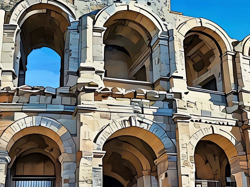 Ein majestätisches römisches Amphitheater erhebt sich vor einem strahlend blauen Himmel. Das antike Bauwerk besteht aus verwittertem Stein, mit zahlreichen Bögen und einem zentralen Turm. Das Amphitheater ist von einer Reihe von Steintreppen umgeben, die zum Eingang hinaufführen. Ein paar Menschen gehen um das Gelände herum und geben dem beeindruckenden Monument ein Gefühl von Größe.