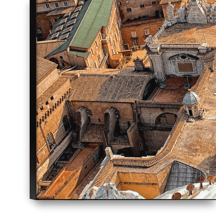 Vanuit de koepel van de Sint-Pietersbasiliek een prachtig uitzicht op de Sint-Pietersplein in Vaticaanstad en de stad Rome. Ook is nog Castel Sant' Angelo te zien.