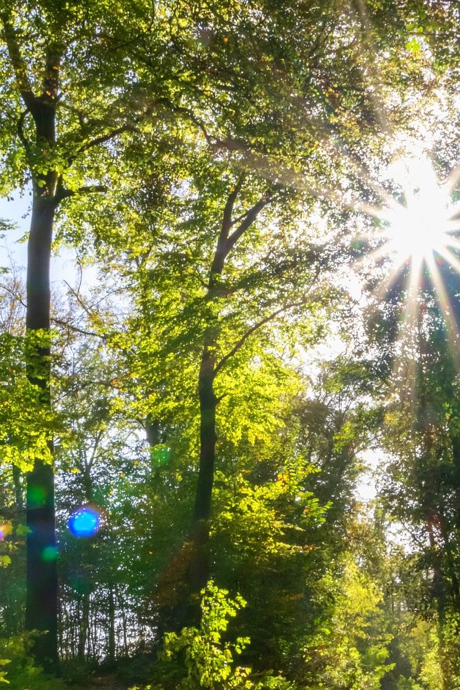 Ein romantischer Weg führt bei schöner Abendsonne durch einen herbstlichen Wald.