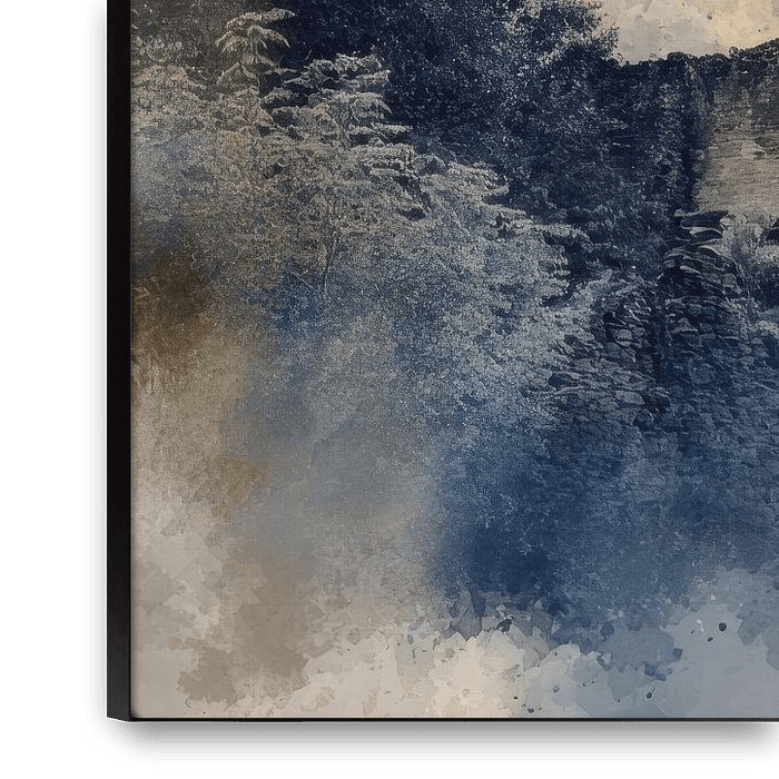 Eine verfallene Ruine steht still zwischen Sträuchern und Bäumen, teilweise in einem leichten Nebel verschmolzen. Die Formen sind weich und fließend, als würde die Landschaft langsam in der Luft verschwinden. Dieses Werk bringt Ruhe und eine verträumte…