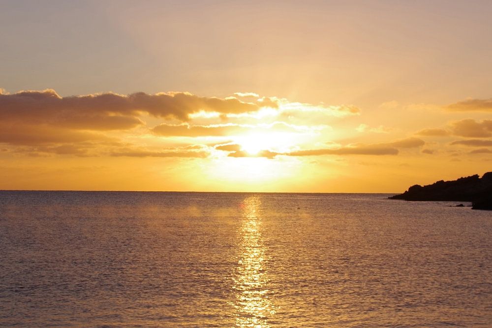 Die aufgehende Sonne wirft ihr orange farbiges Licht auf das Wasser und den Strand von Mallorca. Am Himmel sind einige Wolken zu sehen. Ein menschenleerer Strand, der viel Ruhe ausstrahlt.