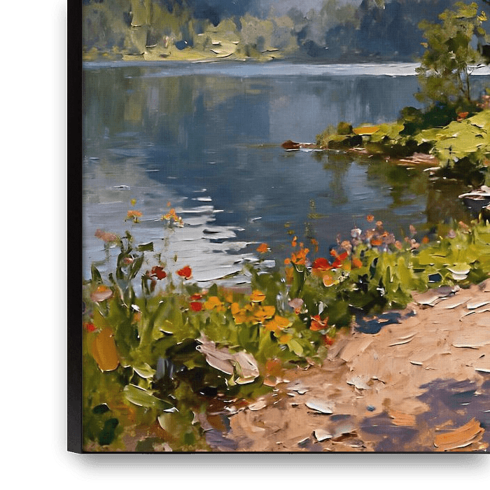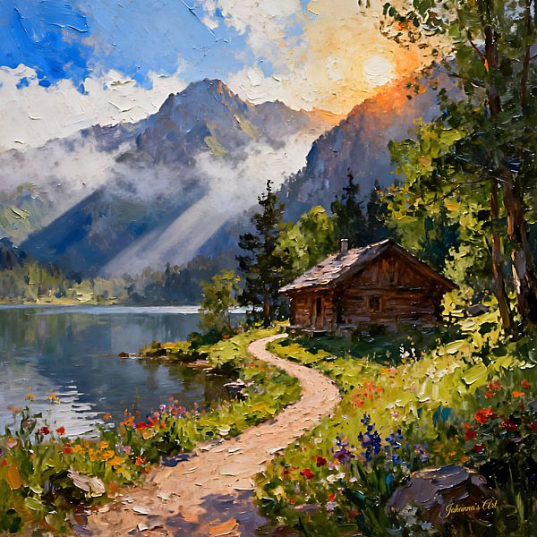 Johanna's atemberaubende Kunstwerke laden Sie ein, in eine Welt der Ruhe und Gelassenheit einzutauchen. Dieses idyllische Blockhaus, eingebettet in hoch aufragende Berge und einen sanft fließenden Fluss, ist eine atemberaubende Szene, die Frieden und Freude in Ihr Zuhause…