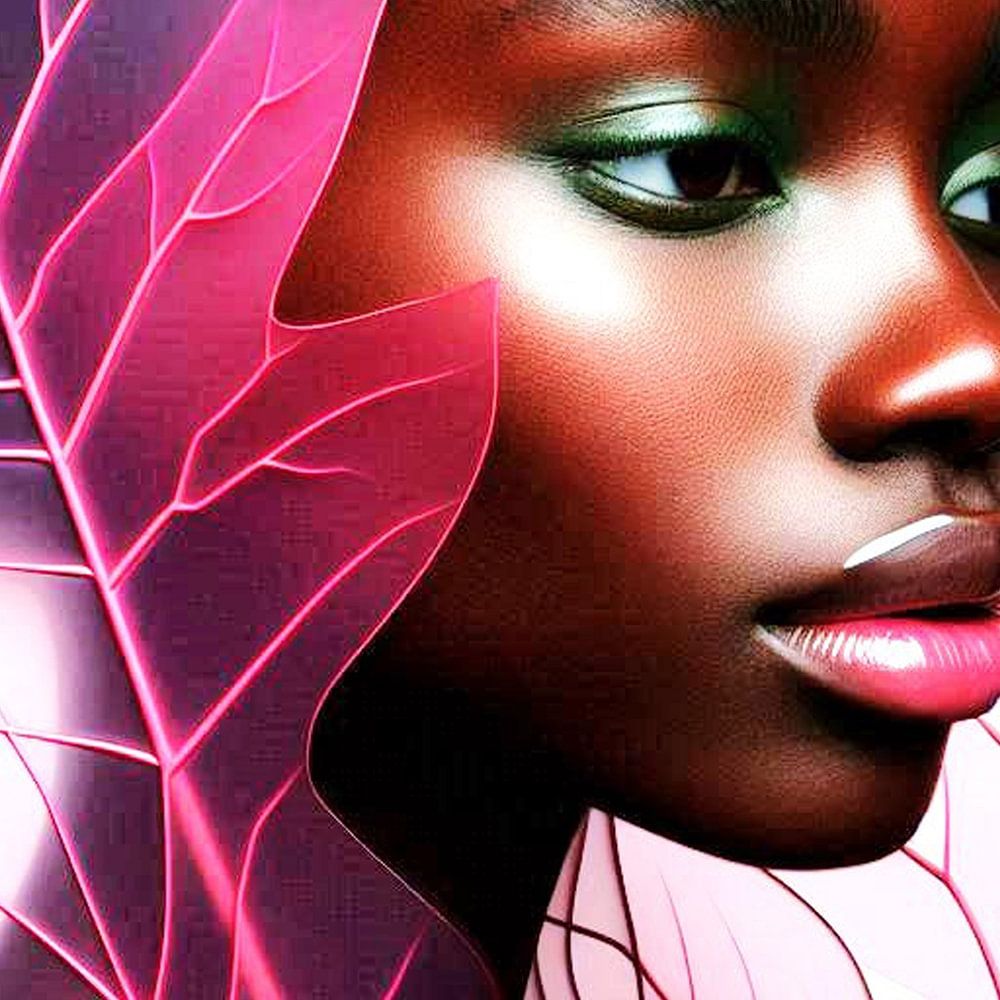 Frauenporträt mit transparenten Baumblättern in sanften Farben.