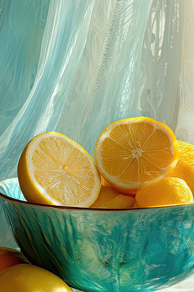 Geschnittene Zitronen und Orangen in türkisfarbenem Geschirr, mit pastellgelben Akzenten und sanften Sonnenlichtschatten. Dieses verträumte und subtil geheimnisvolle Werk ist Teil der Kollektion "Romantisches und verträumtes Stillleben - Geheimnisvolle Eleganz" und verschönert eine Küche, ein Esszimmer oder eine sommerliche Inneneinrichtung.