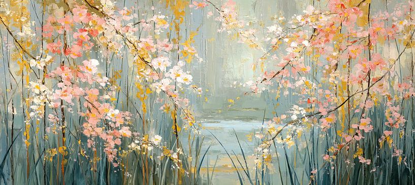 Pink Flowers - Dieses Blumenbild zeigt ein wunderschönes Spiel aus zartrosa Blumen und goldenen Akzenten, die zusammen mit den kühlen Grün- und Blautönen eine ruhige und fröhliche Atmosphäre schaffen.