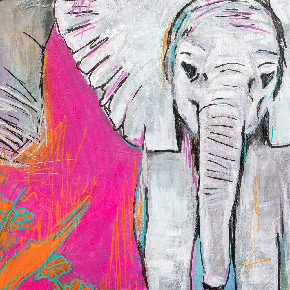 Dieses Kunstwerk wurde während meiner Reise durch Myanmar inspiriert. Hier sah ich Elefantenherden mit einem niedlichen und verspielten Kalb. Das kleine Tier lief auf mich zu und fing tatsächlich an, mit mir zu spielen. Unterschätzen Sie diese Riesen nicht, auch wenn sie noch so klein sind. Die Liebe und die Sensibilität der Elefanten…