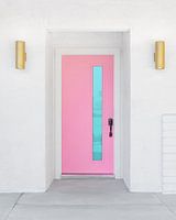 Bestelle dieses moderne Wandbild Rosa Tür mit blauem Fenster von Tom Windeknecht als Reproduktion auf Leinwand, Alu-Dibond, als Poster, Fototapete oder Acrylglasbild.