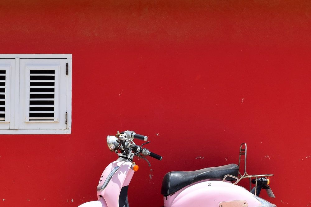 Fröhliches Bild eines rosa Vespa-Rollers, der vor einer leuchtend roten Wand in der Sonne geparkt ist