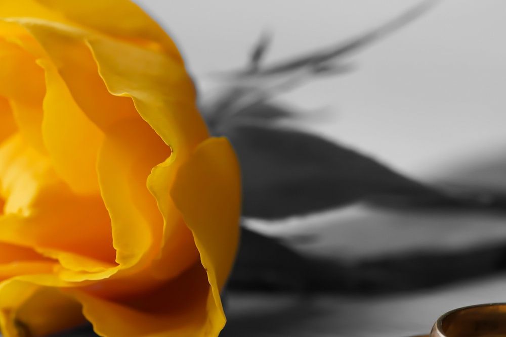 gelb blühende Rose mit zwei Eheringen als Zeichen der Liebe und der Zuneigung zweier Menschen zueinander