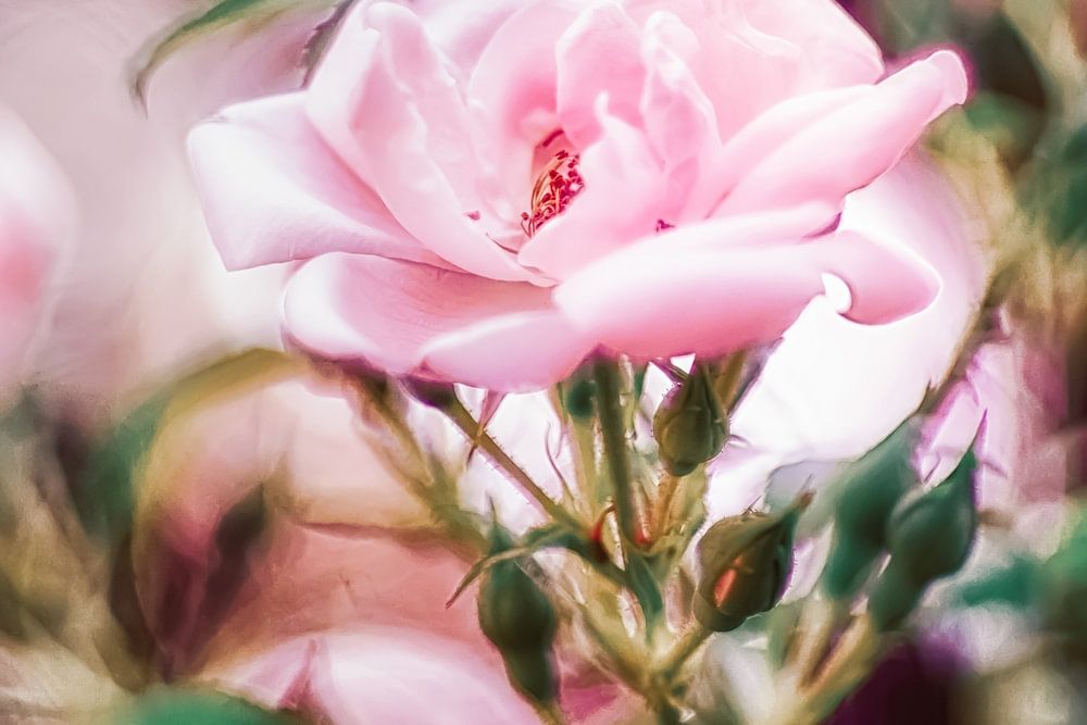 Romantisches Bild in Rosa und Grün. Zauberhafte Rosenblüten und Rosenknospen im Gegenlicht des noch jungen Morgens in verschwenderischer Farbexplosion.