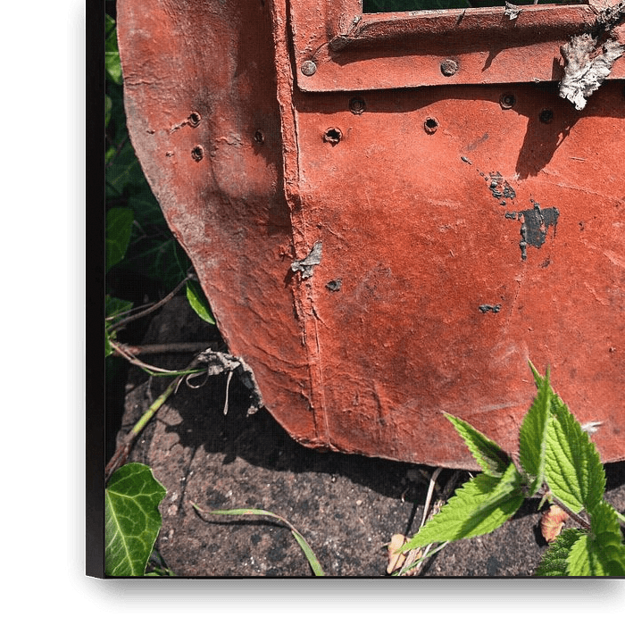 Bestelle das Foto Rost und Ruine - Vergessene Schweißerschutzmaske von der Natur überholt von InfiniteArtLabs als Reproduktion auf Leinwand, Alu-Dibond, als Poster, Fototapete oder Acrylglasbild.