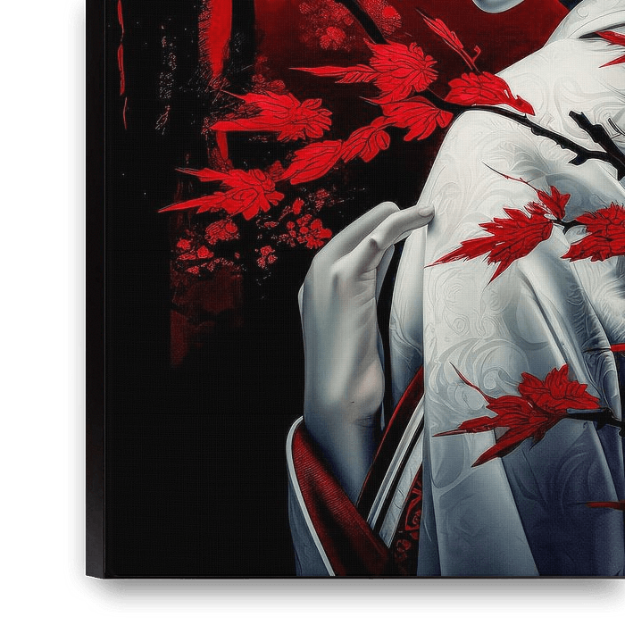 Dieses beeindruckende Porträt strahlt eine faszinierende Kombination aus Anmut und Stärke aus. Die Figur einer Geisha steht im Mittelpunkt, umgeben von einem tiefen, intensiven Rot, das sowohl die Blumen in ihrem Haar als auch den Hintergrund dominiert. Die sanft geschwungenen Linien ihrer Frisur und die filigranen Blütenblätter der…