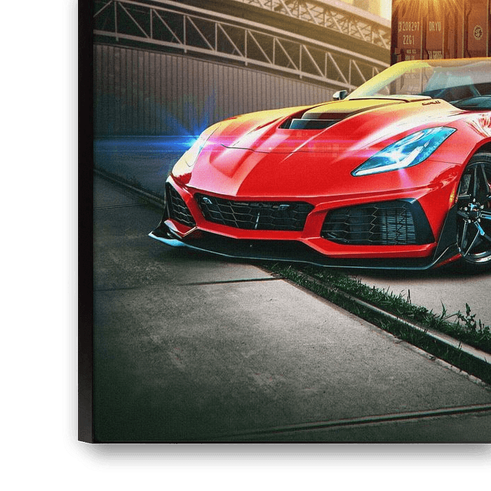 Eine auffallend rote Chevrolet Corvette Z06 ist in einem Industriegebiet unter einem Schiffscontainer geparkt und wird von der starken Sonne gegen den bewölkten Himmel angestrahlt.