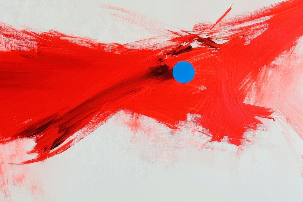 Ein kraftvolles Spiel aus leuchtendem Rot streckt sich dynamisch über die Leinwand, während ein kleiner blauer Punkt stille Akzente setzt. Diese Komposition strahlt Energie und Leidenschaft aus, perfekt für ein modernes Wohnzimmer, wo sie als lebendiger Blickfang Gespräche anregen kann. Die harmonische Balance zwischen wild und ruhig inspiriert jeden Besucher.