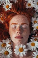 Das Bild zeigt ein verträumtes Porträt einer Person mit leuchtend rotem Haar, das sanft auf weißen Gänseblümchen ruht. Ihre Haut ist mit zarten Sommersprossen übersät, und ihre geschlossenen Augen strahlen eine friedliche Anmut aus. Die harmonische Verbindung von Haarfarbe und Blumen schafft eine lebendige, sommerliche Atmosphäre.