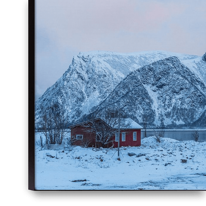 Entdecken Sie die ruhige Schönheit der Lofoten-Inseln mit diesem bezaubernden Foto einer roten Hütte, die wunderschön am Wasser in der Nähe von Lyngvær liegt. Der Winter in Norwegen bietet einen einzigartigen Zauber, den dieses Bild perfekt einfängt. Während die Sonne sanft aufsteigt, färbt sich der Himmel in sanften Pastelltönen von…