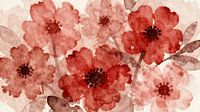 Dieses kraftvolle und dekorative Aquarellgemälde zeigt eine dichte Komposition aus überlappenden Mohnblüten in expressiven Rottönen auf cremefarbenem Hintergrund. Die großen, runden Blütenköpfe mit ihren markanten schwarzen Staubgefäßen dominieren das gesamte Bildformat und füllen es mit vitaler, sinnlicher Energie. Die Farbpalette…