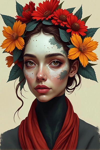 Dieses Gemälde fängt die bezaubernde Schönheit einer Frau ein, deren Gesicht teilweise mit einer kunstvollen Blumenmalerei verziert ist. Die tiefroten Blütenblätter verschmelzen mit ihrer Haut und schaffen ein mystisches und ausdrucksstarkes Bild. Die warmen Farbtöne und die subtilen Details machen dieses Kunstwerk perfekt für ein Interieur, das Kraft, Leidenschaft und Raffinesse ausstrahlt. Ein echter Blickfang für Liebhaber von künstlerischen Porträts und floraler Kunst.
