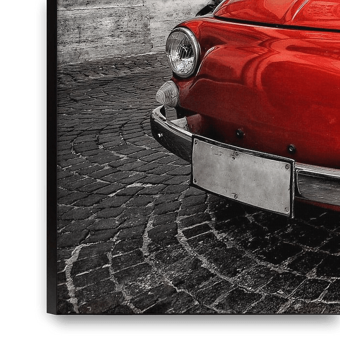 Bestelle das Foto Roter Fiat 500 alter Oldtimer-Oldtimer in Italien auf schwarz-weißem Hintergrund von Miljko Kucevic als Reproduktion auf Leinwand, Alu-Dibond, als Poster, Fototapete oder Acrylglasbild.