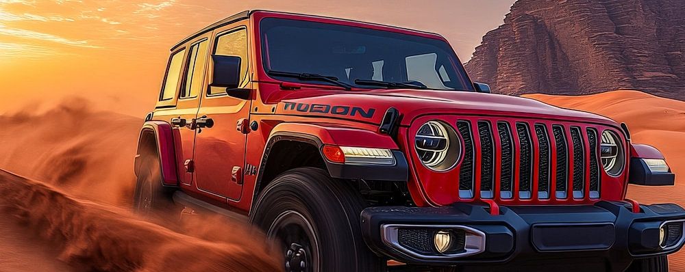 Ein roter Jeep Wrangler fährt unter einem feurigen Sonnenuntergang durch die weitläufigen Wüstendünen und wirbelt goldenen Sand auf, während er sich einen Weg durch die raue Wildnis bahnt. Ein kühnes Symbol der Freiheit, der Kraft und des Entdeckergeistes.