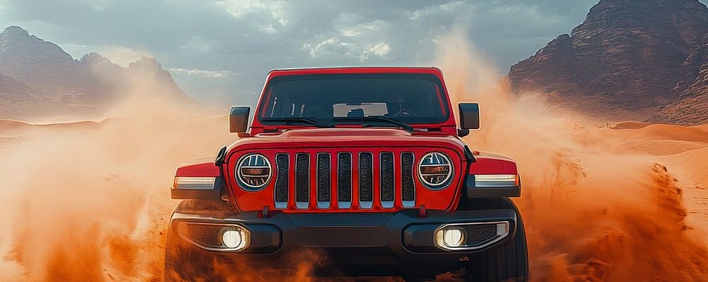 Ein roter Jeep Wrangler fährt unter einem feurigen Sonnenuntergang durch die weitläufigen Wüstendünen und wirbelt goldenen Sand auf, während er sich einen Weg durch die raue Wildnis bahnt. Ein kühnes Symbol der Freiheit, der Kraft und des Entdeckergeistes.