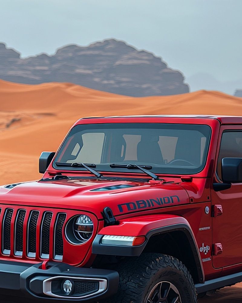 Ein roter Jeep Wrangler fährt unter einem feurigen Sonnenuntergang durch die weitläufigen Wüstendünen und wirbelt goldenen Sand auf, während er sich einen Weg durch die raue Wildnis bahnt. Ein kühnes Symbol der Freiheit, der Kraft und des Entdeckergeistes.