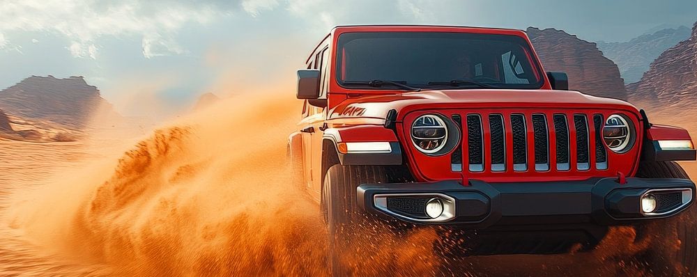 Ein roter Jeep Wrangler fährt unter einem feurigen Sonnenuntergang durch die weitläufigen Wüstendünen und wirbelt goldenen Sand auf, während er sich einen Weg durch die raue Wildnis bahnt. Ein kühnes Symbol der Freiheit, der Kraft und des Entdeckergeistes.