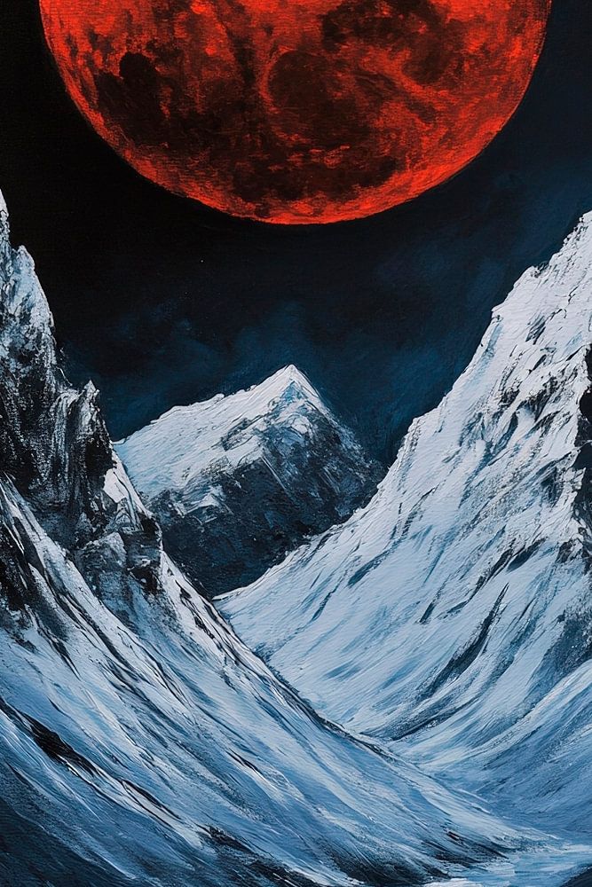 Ein faszinierendes Landschaftsgemälde entführt in eine mystische Welt, wo ein rubinroter Mond über majestätischen, schneebedeckten Bergen strahlt. Die kontrastreichen Farben und die tiefen Schatten verleihen dem Kunstwerk einen dramatischen Ausdruck. Ideal für das Wohnzimmer, schafft es eine fesselnde Atmosphäre und regt die Fantasie an.