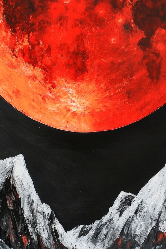 Ein majestätischer roter Vollmond thront über schneebedeckten Gipfeln, während die Dunkelheit der Nacht die Szenerie umhüllt. Diese beeindruckende Darstellung von Naturgewalten verleiht einem gemütlichen Wohnzimmer eine dramatische Note und regt zu träumerischen Gesprächen an. Die kraftvolle Farbkomposition schafft eine einladende und zugleich mystische Atmosphäre.