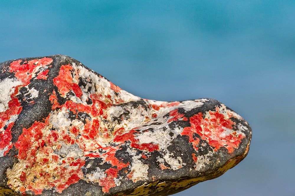 Roter Naturstein an der Küste am Meer. Die auffälligen roten Flechten, die auf diesem Naturstein wachsen, verleihen ihm ein schönes Aussehen. Dieses Bild habe ich am Strand der Insel Bonaire aufgenommen.