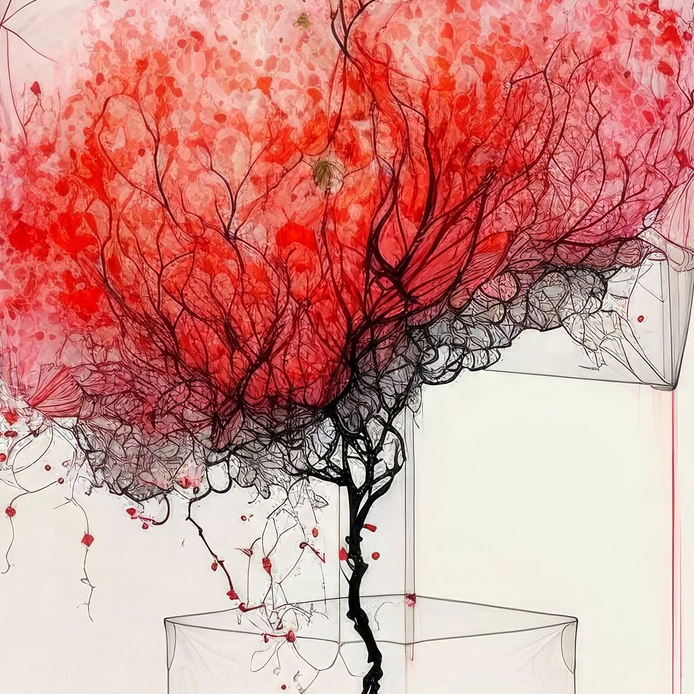Die Wandkunstwerke zeigen eine Reihe von fantasievollen Miniaturbäumen, die im filigranen und detaillierten Stil ausgeführt sind. Die rote Farbpalette dominiert und verleiht den Kunstwerken eine dramatische Wirkung. Die Zweige der Bäumchen winden sich in einem Wirbel von Linien nach oben und scheinen in der Luft zu schweben. Die surrealistischen Werke enthalten auch Elemente der Textilkunst, mit Fäden und Seilen, die aus den Ästen der Bäume zu sprießen scheinen und ein Netz von Linien bilden. Die rote Farbe in den Kunstwerken symbolisiert Emotionen wie Leidenschaft und Energie, während die Bäumchen für Leben, Wachstum und Verbundenheit mit der Natur stehen. Die Kunstwerke haben eine geheimnisvolle und magische Aura.