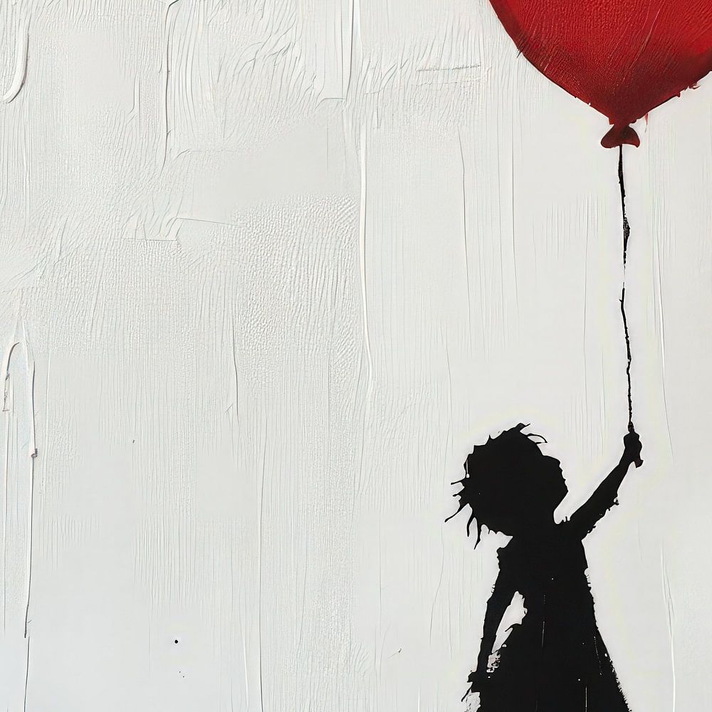 Abstrakte Malerei. Zeichnung. Stadt. Grün. Banksy-Stil. Mann. Auto. Einkaufsstraße. Luftballon. Gelb. Rot. Einkaufsstraße. Urban. Industriell. Frau. Kind. Bruder. Schwester.