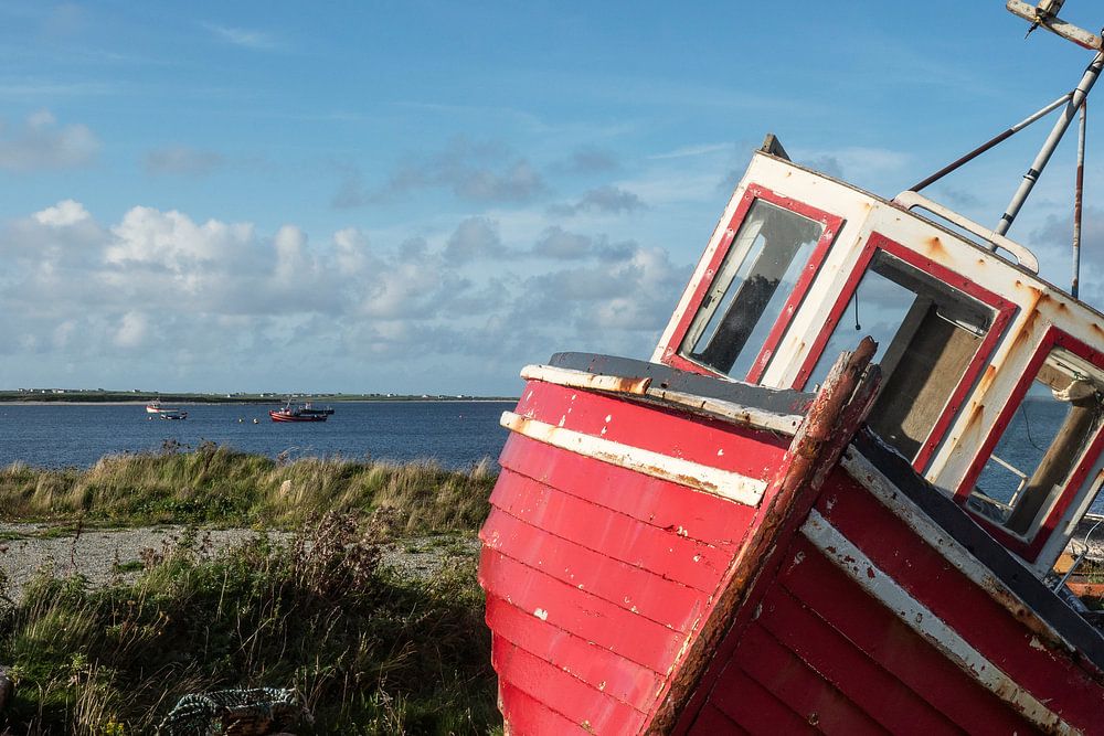 Ein Fischerboot an der Küste der Halbinsel The Mullet Peninsula in der Grafschaft Mayo. Die Vokuhila-Halbinsel (irisch: Leithinis und Mhuirthead) - auch bekannt als die Vokuhila (eine Mhuirthead) und manchmal als die Erris-Halbinsel - ist eine Halbinsel in der Baronie Erris in der Grafschaft Mayo, Irland. Es besteht aus einer großen Landzunge, die durch eine schmale Landenge mit dem Festland von Belmullet (Béal an Mhuirthead), einer Stadt mit etwa 2.000 Einwohnern, verbunden ist.