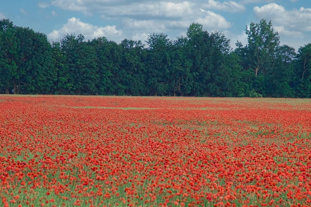 Mohnblumen Feld. Rote Blüten mit grünen Blättern. Frühsommer Blumen.