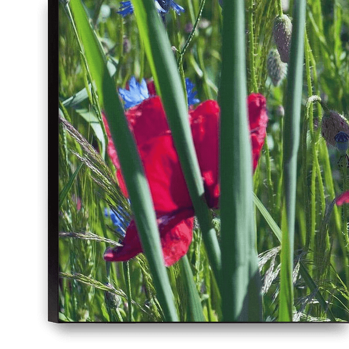 Bestelle dieses Landschafts-Wandbild Rotes Mohnfeld mit blauen Kornblumen von Silva Wischeropp als Reproduktion auf Leinwand, Alu-Dibond, als Poster, Fototapete oder Acrylglasbild.
