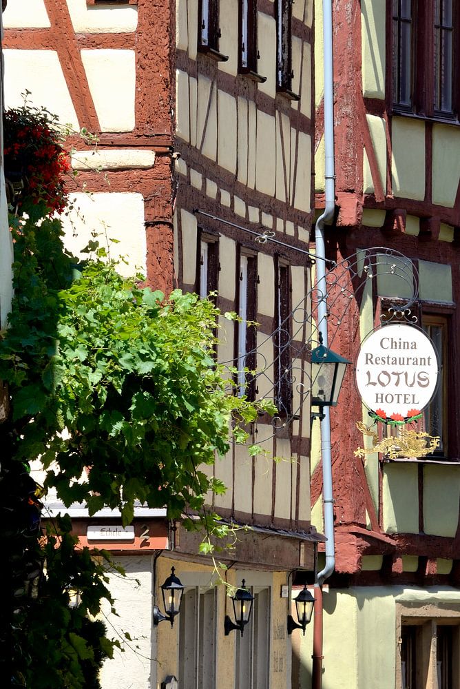 Rothenburg ob der Tauber, Gasse mit Fachwerkhäusern. Malerische Fotografie der alten Stadt mit ihren alten mittelalterlich wirkenden Stadthäusern