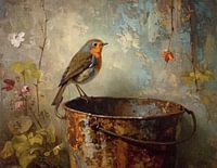 Ein Rotkehlchen setzt sich kurz auf den Rand eines rostigen Eimers. Ein farbenfrohes Kunstwerk in Erdtönen, bei dem Rostbraun schön mit Taupe, Beigegrün und Blau harmoniert. Ein nostalgisches Kunstwerk mit Vintage-Charakter.