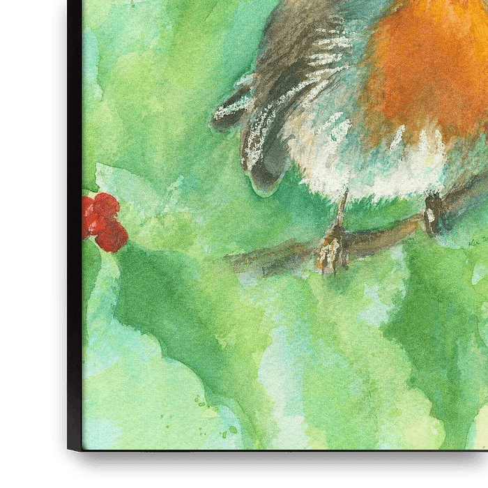 Bestelle dieses Vögel Wandbild Rotkehlchen im Ilexbusch Hochformat von Karen Kaspar als Reproduktion auf Leinwand, Alu-Dibond, als Poster, Fototapete, ArtFrame oder Acrylglasbild, maßgefertigt in höchster Qualität.