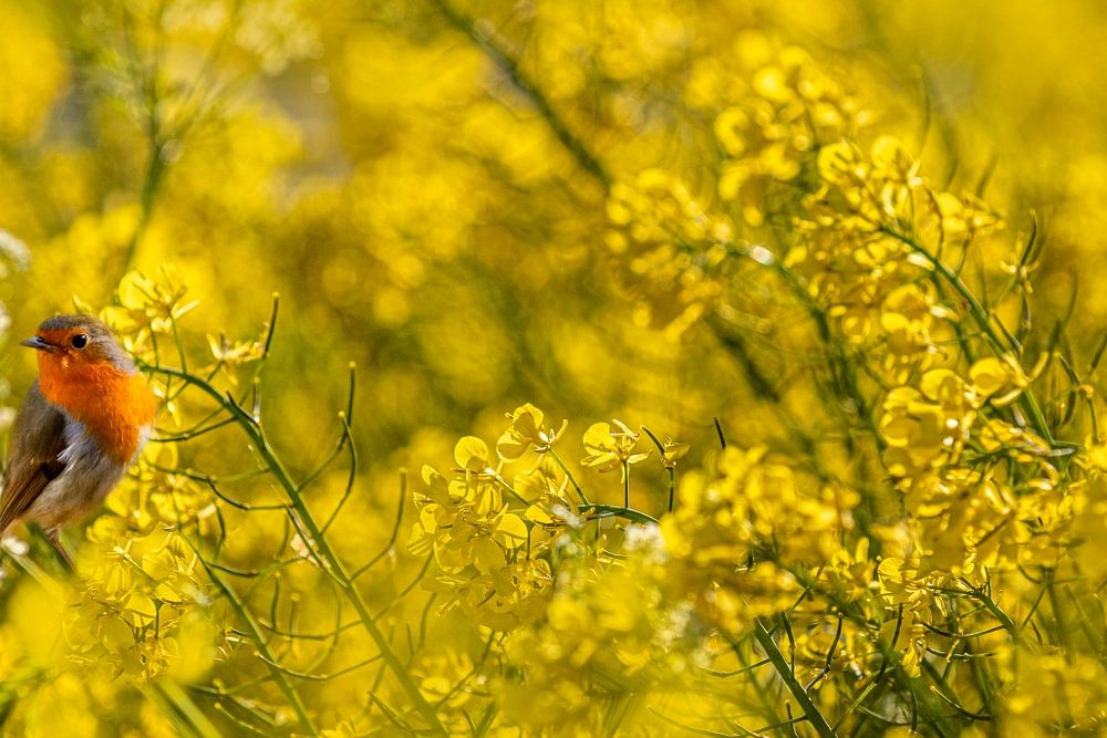 Diese hauptsächlich gelbe Fotografie ist bildschirmfüllend und zeigt ein kleines Rotkehlchen, das in den Blumen sitzt und sich umsieht.