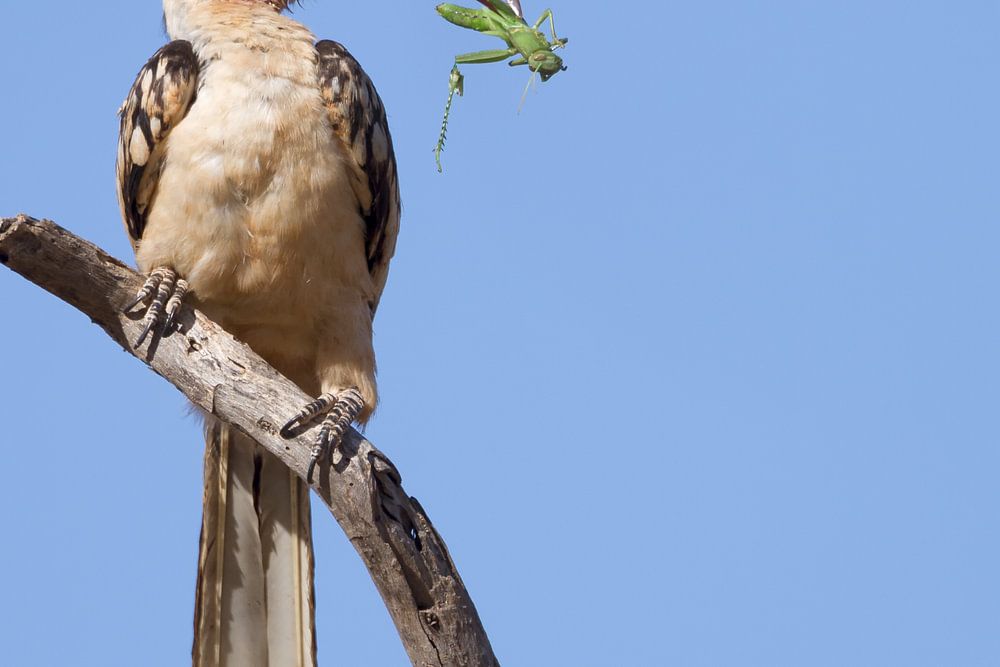 Ein Rotschnabeltoko mit einem Grashüpfer. Gesehen in Kenia im Lake-Nakuru Nationalpark.