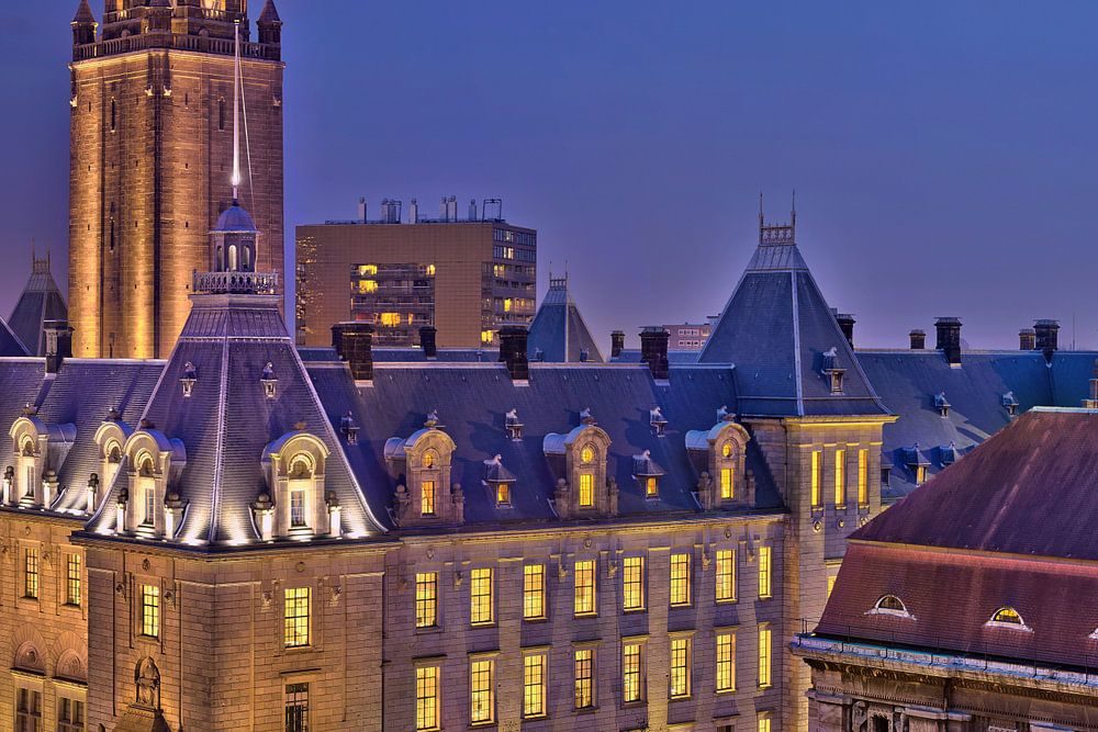 Een zeer hoge resolutie (80Mp) opname van van het stadhuis van Rotterdam vroeg in de avond. Op een grote vergroting kun je bijzonder veel details verwachten die hier in het klein verborgen blijven.