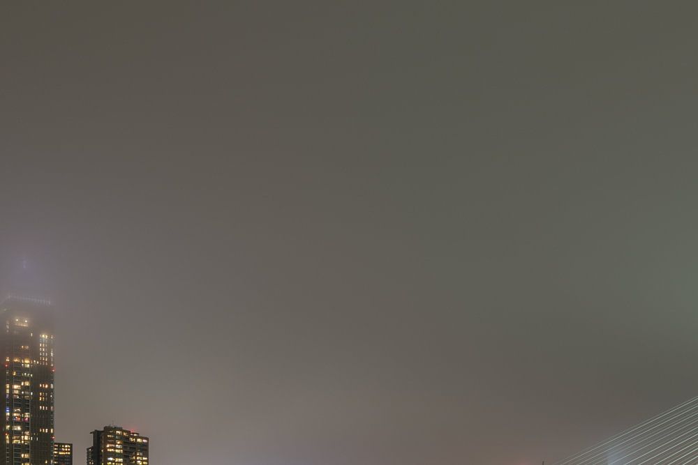 Rotterdam ist architektonisch gesehen eine untypische niederländische Stadt. Entlang der Maas verleihen viele Hochhäuser der Stadt eine einzigartige Skyline. Nachts, bei tief hängenden Wolken, ist es umso schöner.