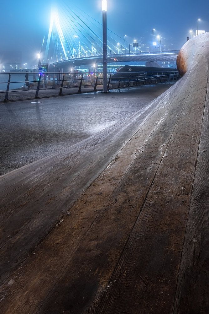 Die Erasmusbrücke wurde von Ben van Berkel (UNStudio) entworfen und 1996 fertiggestellt. Die 284 Meter lange Schrägseilbrücke hat einen 139 Meter hohen asymmetrischen Stahlpylon, der gelenkig gelagert ist. Aus diesem Grund trägt die Brücke den Spitznamen "Der Schwan".