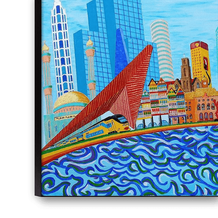Dieses fröhliche und farbenfrohe Gemälde (80 x 120 cm in Acrylfarbe) spiegelt meinen persönlichen Eindruck vom neuen Rotterdam 2017 wider, mal realistisch, mal mit einem Augenzwinkern.