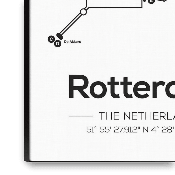 Minimalistischer Druck im skandinavischen Stil der Metrolinien von Rotterdam. Dieses Poster ist Teil einer Reihe von U-Bahn-Linien in Großstädten. Schauen Sie sich unsere U-Bahn-Poster mit Budapest, Berlin und Rom an. Natürlich durfte auch unser eigenes Rotterdam in dieser Serie nicht fehlen.