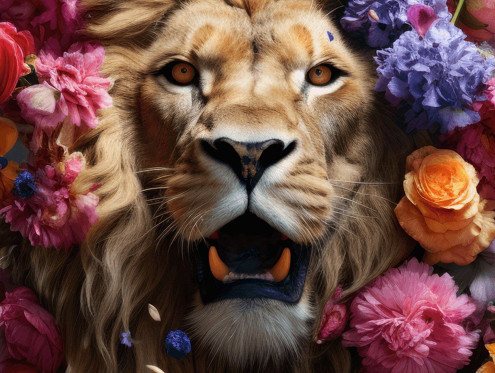 Royal Blossom' ist ein beeindruckendes Kunstbild, das die majestätische Kraft eines Löwen mit der sanften Schönheit von Blumen verbindet. Hier ist der König des Dschungels nicht nur von seiner traditionellen Mähne umgeben, sondern auch von einer reichen Vielfalt an Blumen in Schattierungen von tiefem Rot, zartem Rosa, Himmelblau und Sonnengelb. Der dunkle Hintergrund unterstreicht die Dramatik und Textur des Löwenfells und der Blumen. Dieses Kunstwerk verleiht jedem Interieur - von einer modernen Stadtwohnung bis hin zu einem klassischen Landhaus - eine kraftvolle Präsenz und bietet eine einzigartige Abwechslung zur traditionellen Tierfotografie.