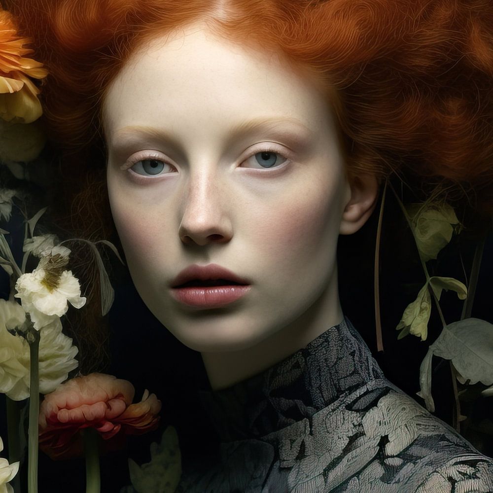 Eine Frau mit auffälligen rubinroten Locken ist liebevoll von einer Vielzahl von Blumen umgeben. Ihre intensive Haarfarbe bildet einen harmonischen Kontrast zu den sanften Farbtönen der Blumen. Dieses Porträt ist so anmutig und symmetrisch, dass es leicht ein elegantes Muster für eine Tapete bilden könnte, das jedem Raum sofort einen Hauch von natürlicher Schönheit und Charme verleiht.